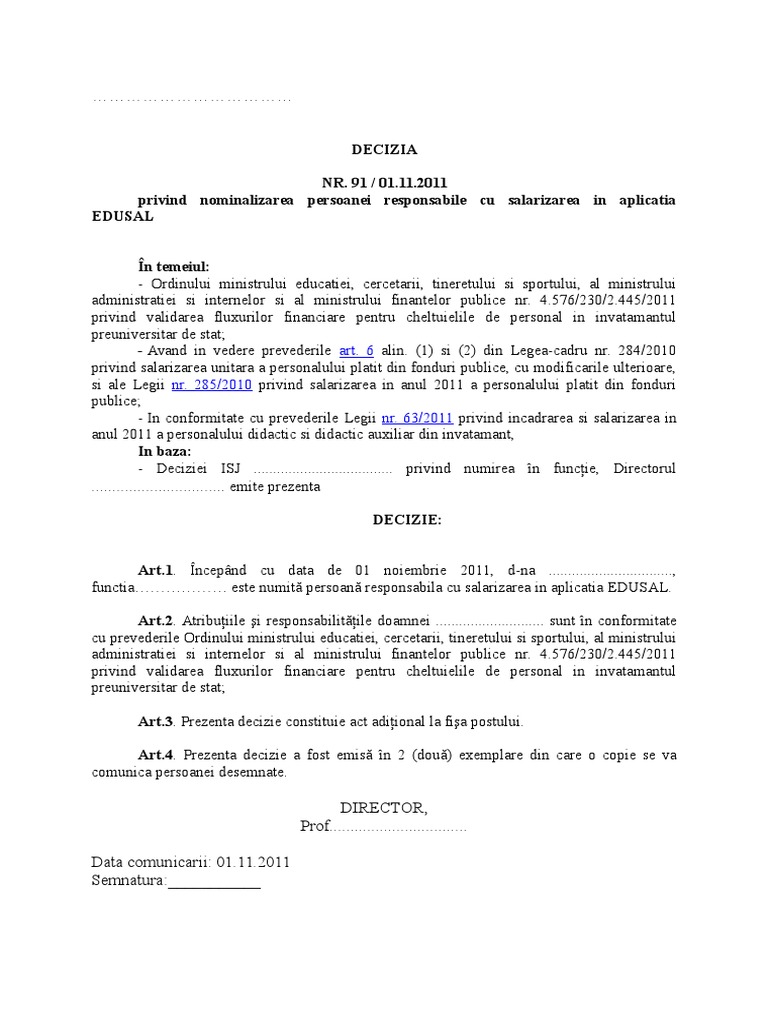 Art.3. Prezenta decizie constituie act adiional la fia postului.