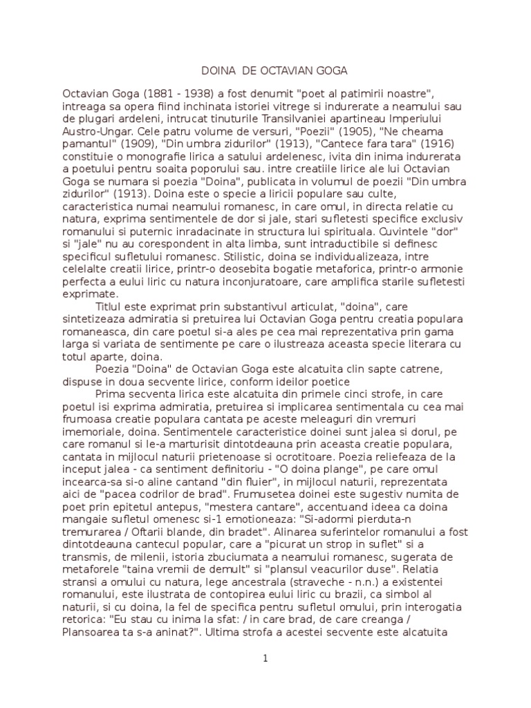 Goga se numara si poezia "Doina", publicata in volumul de poezii "Din umbra