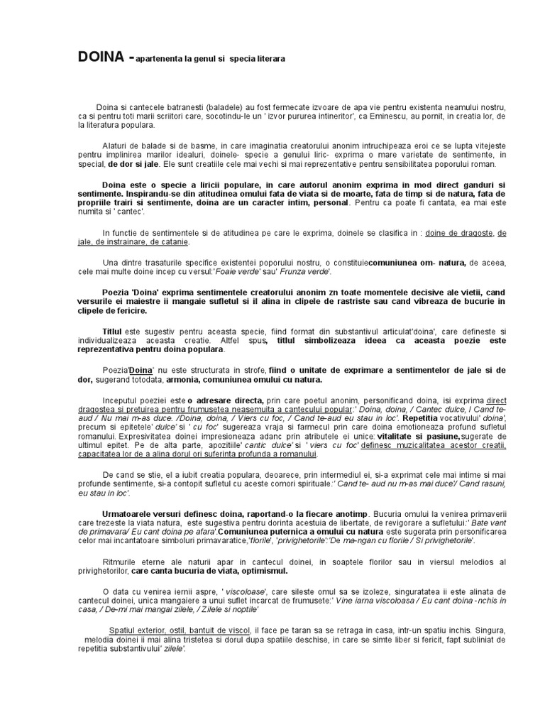 Doina este o specie a liricii populare, in care autorul anonim exprima in mod direct ganduri si