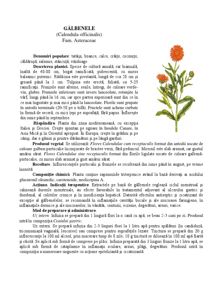 amrui srat. Flores Calendulae sine receptaculis format din florile ligulate uscate de culoare galbenportocalie, cu miros slab aromat i gust amrui srat.