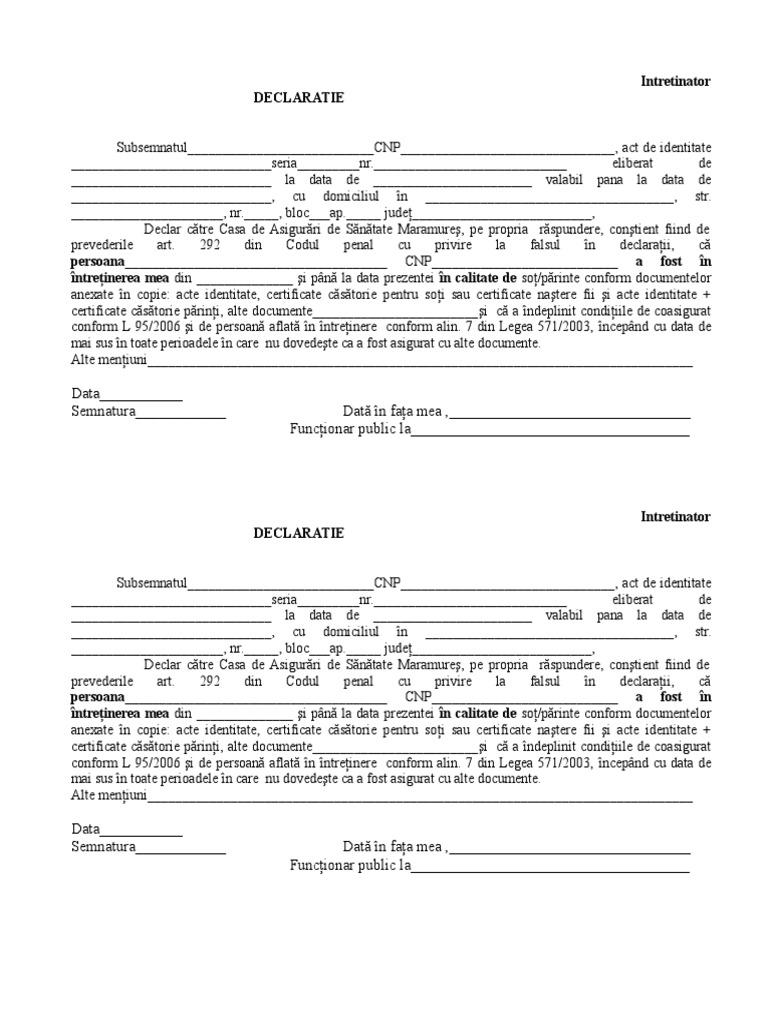 Declar ctre Casa de Asigurri de Sntate Maramure, pe propria rspundere, contient fiind de