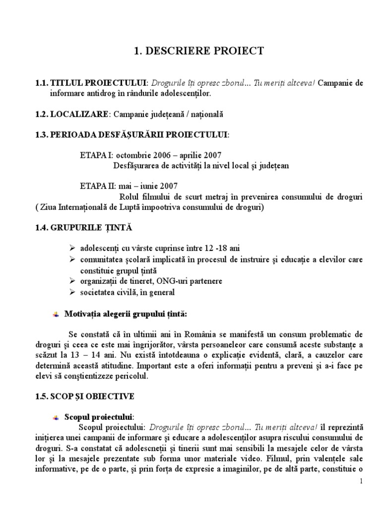 1.1. TITLUL PROIECTULUI: Drogurile i opresc zborul... Tu merii altceva! Campanie de