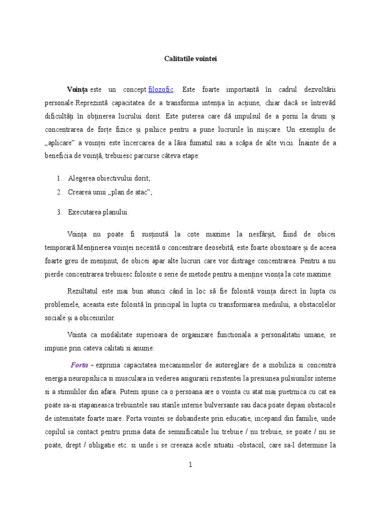 de intensitate foarte mare. Forta vointei se dobandeste prin educatie, incepand din familie, unde