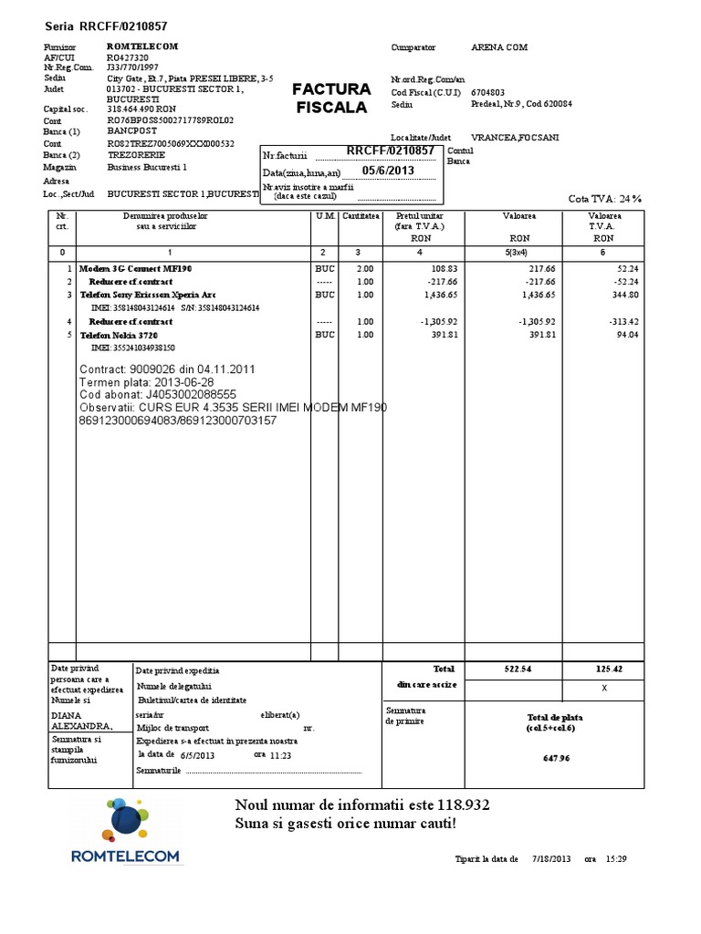 Observatii: CURS EUR 4.3535 SERII IMEI MODEM MF190