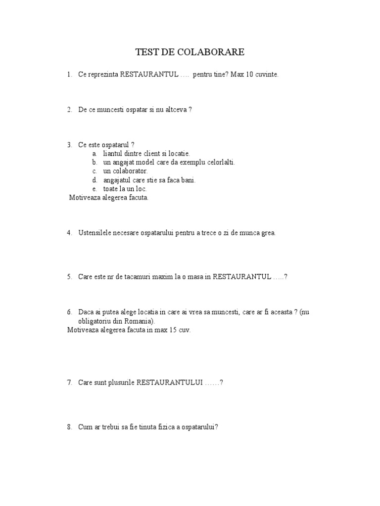 1. Ce reprezinta RESTAURANTUL . pentru tine? Max 10 cuvinte.