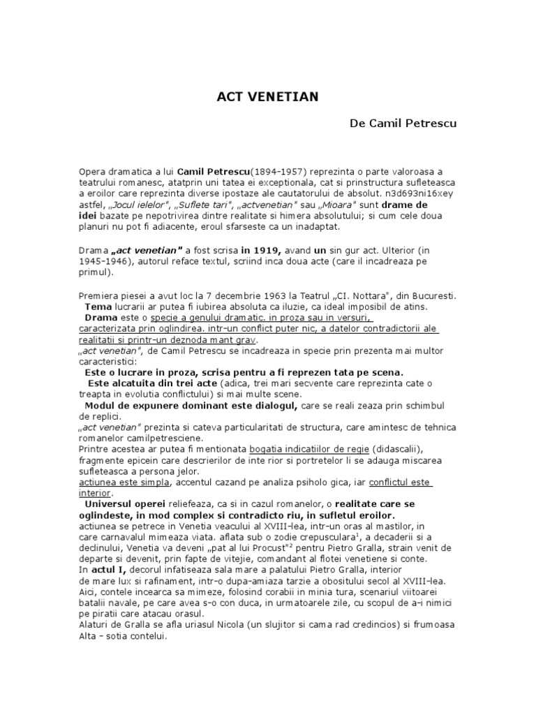 act venetian", de Camil Petrescu se incadreaza in specie prin prezenta mai multor