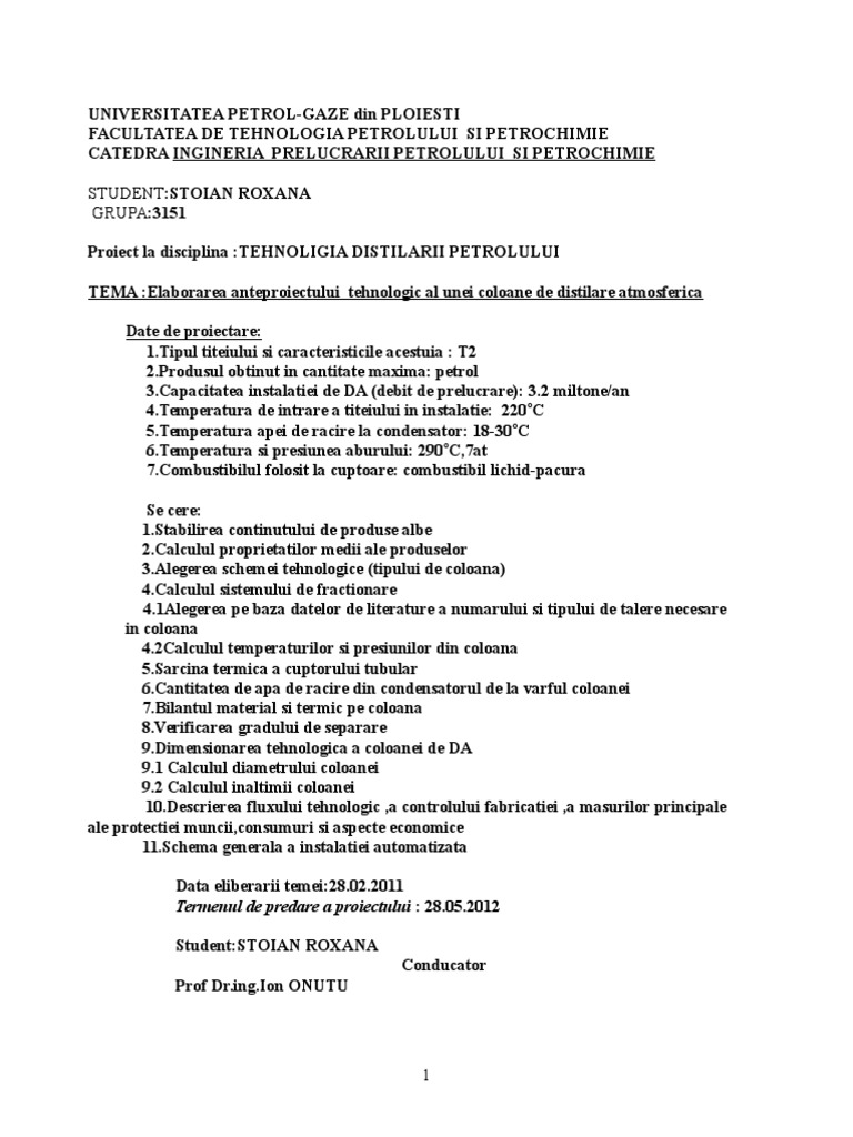 4.3.8Calculul temperaturii pe talerul de extragere a petrolului tD2 ..................30