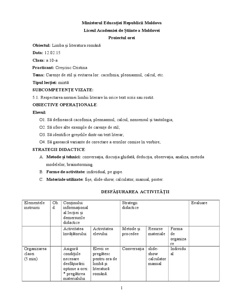 Tema: Carene de stil i evitarea lor: cacofonia, pleonasmul, calcul, etc.