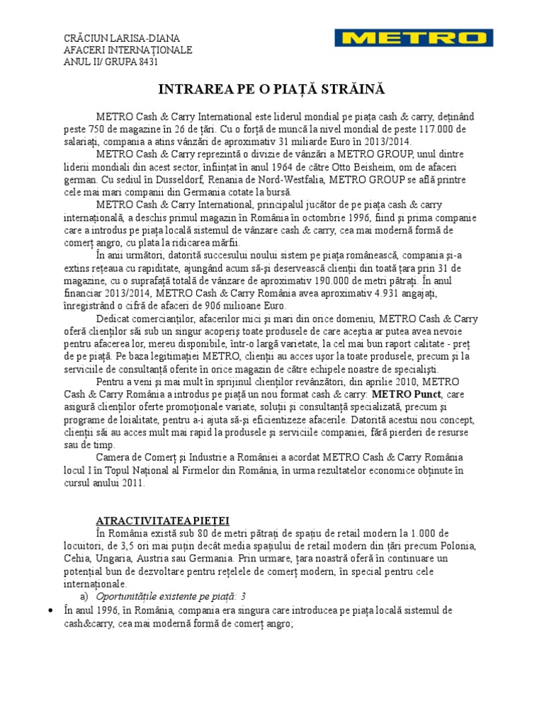 METRO Cash & Carry International, principalul juctor de pe piaa cash & carry