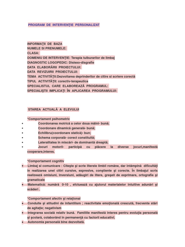 PROGRAM DE INTERVENIE PERSONALIZAT
