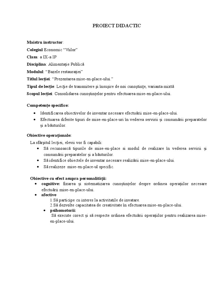 La modulul Bazele restauraiei, elevii i-au nsuit definiia mise-en-place-ului, obiecte de