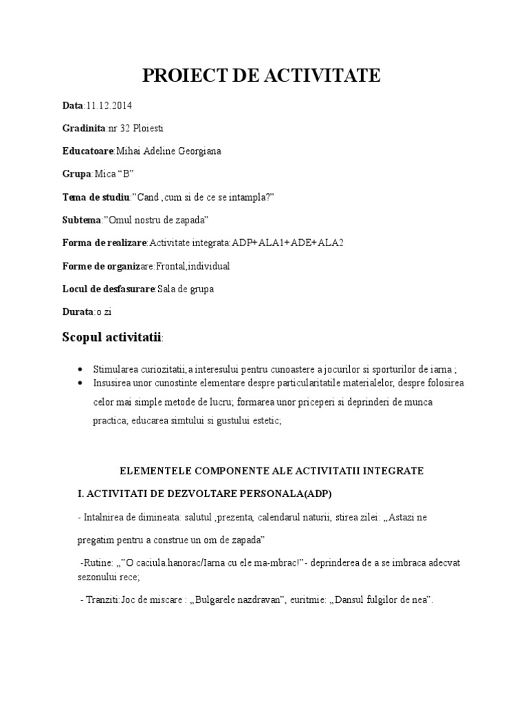Forma de realizare:Activitate integrata:ADP+ALA1+ADE+ALA2