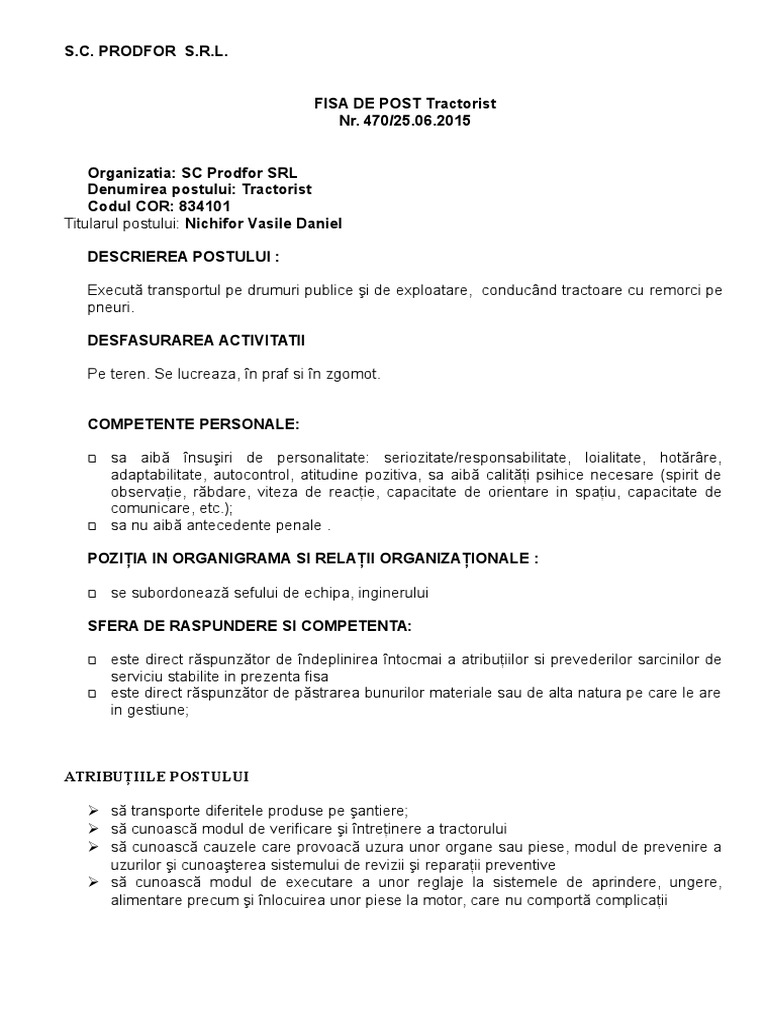 FISA DE POST Tractorist