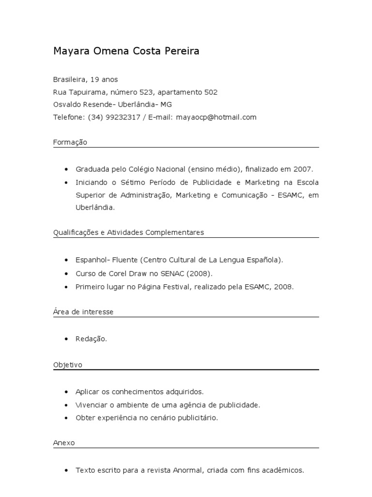 Brasileira, 19 anos Rua Tapuirama, número 523, apartamento 502 Osvaldo Resende- Uberlândia- MG Telefone: (34) 99232317 / E-mail: mayaocp@hotmail.com