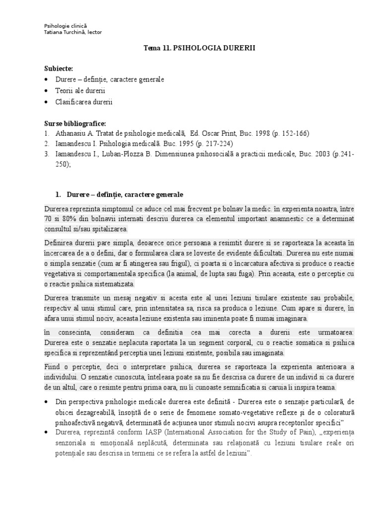 Definirea durerii pare simpla, deoarece orice persoana a resimtit durere si se raporteaza la aceasta n