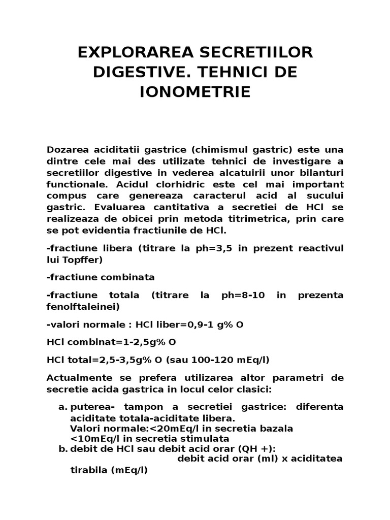 gastric. Evaluarea cantitativa a secretiei de HCl se