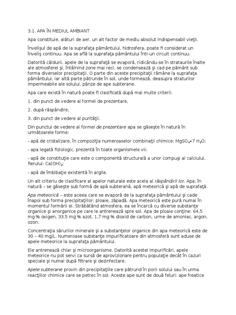 Apa constituie, alturi de aer, un alt factor de mediu absolut indispensabil vieii.