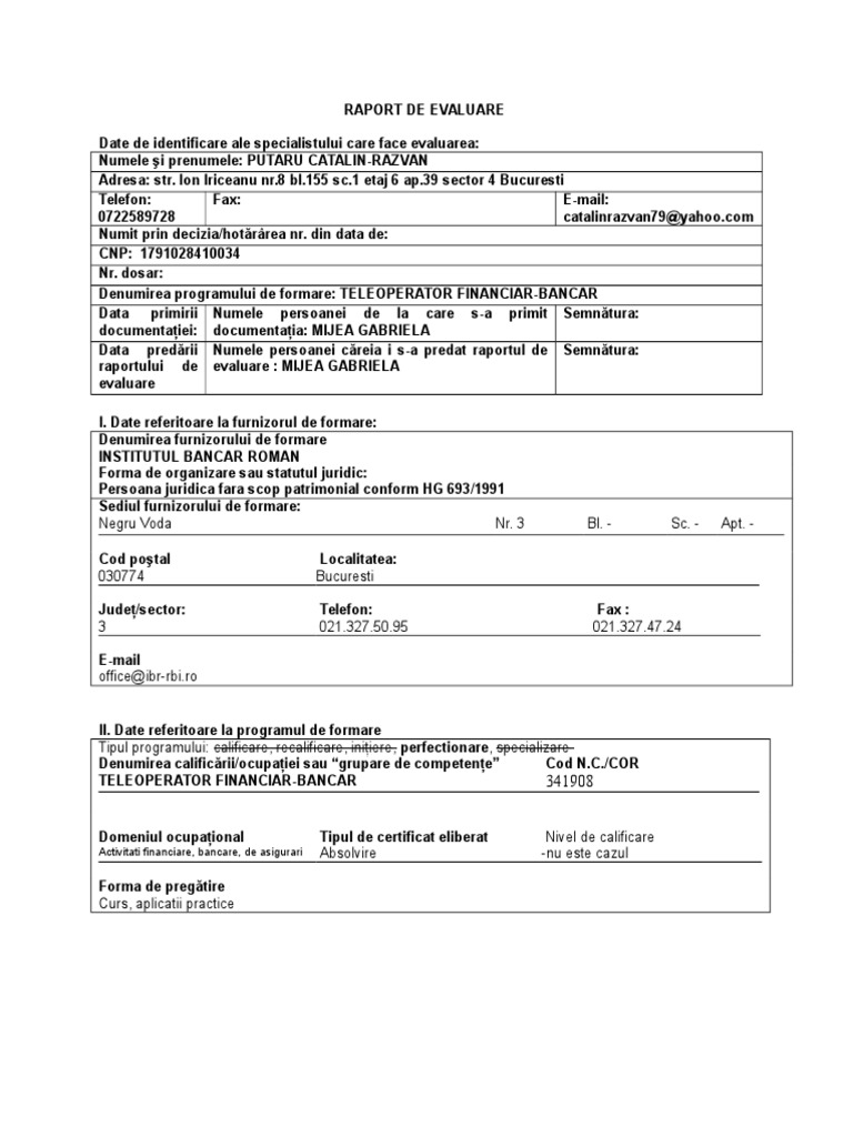 realizat de catre furnizorul de formare profesionala, prin specialisti din domeniul bancar.