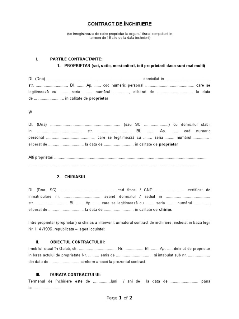 Intre proprietar (proprietari) si chirias a intervenit urmatorul contract de inchiriere, incheiat in baza legii