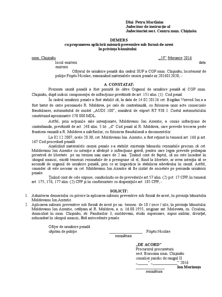 1. Admiterea demersului cu privire la aplicarea msurii preventive sub form de arest, n privina bnuitului