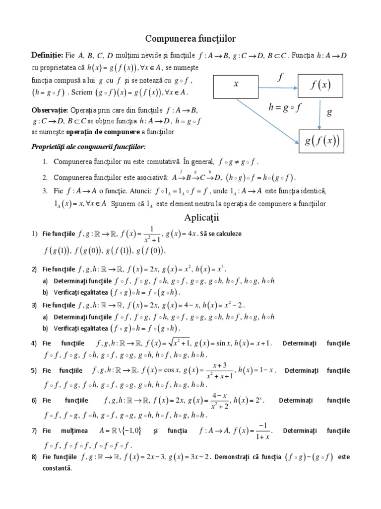 Definiie: Fie A, B, C, D mulimi nevide i funciile f : A B, g : C D, B C . Funcia h : A D