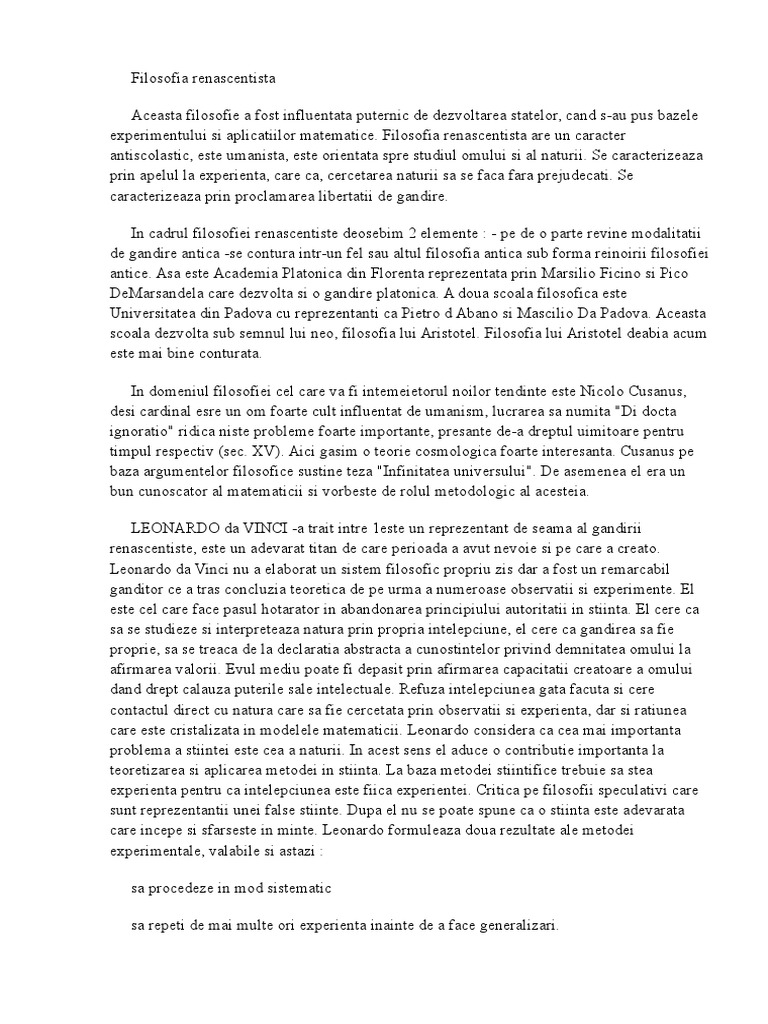 experimentului si aplicatiilor matematice. Filosofia renascentista are un caracter
