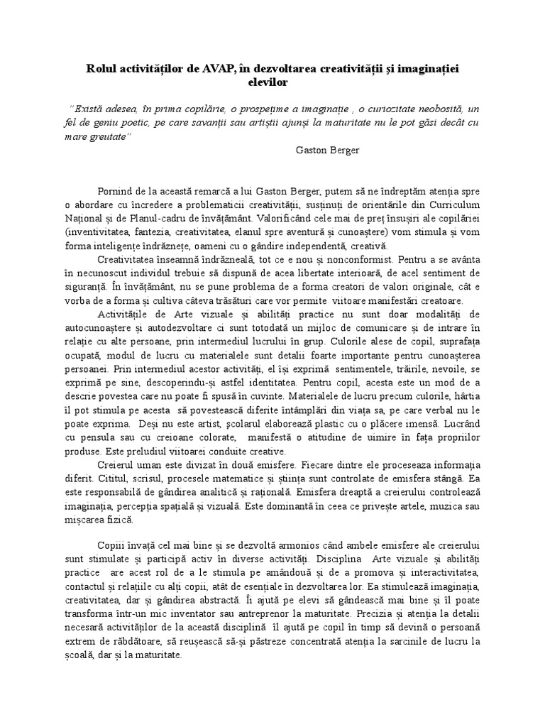 Rolul activitilor de AVAP, n dezvoltarea creativitii i imaginaiei