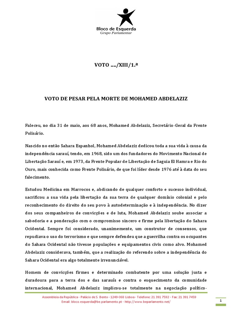 internacional, Mohamed Abdelaziz implicou-se totalmente na negociao polticoAssembleia da Repblica - Palcio de S. Bento - 1249-068 Lisboa - Telefone: 21 391 7592 - Fax: 21 391 7459