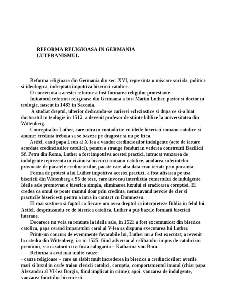 Initiatorul reformei religioase din Germania a fost Martin Luther, pastor si doctor in