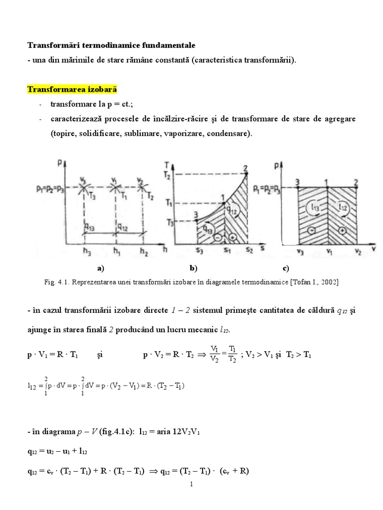 Fig. 4.1. Reprezentarea unei transformri izobare n diagramele termodinamice [Tofan I., 2002]