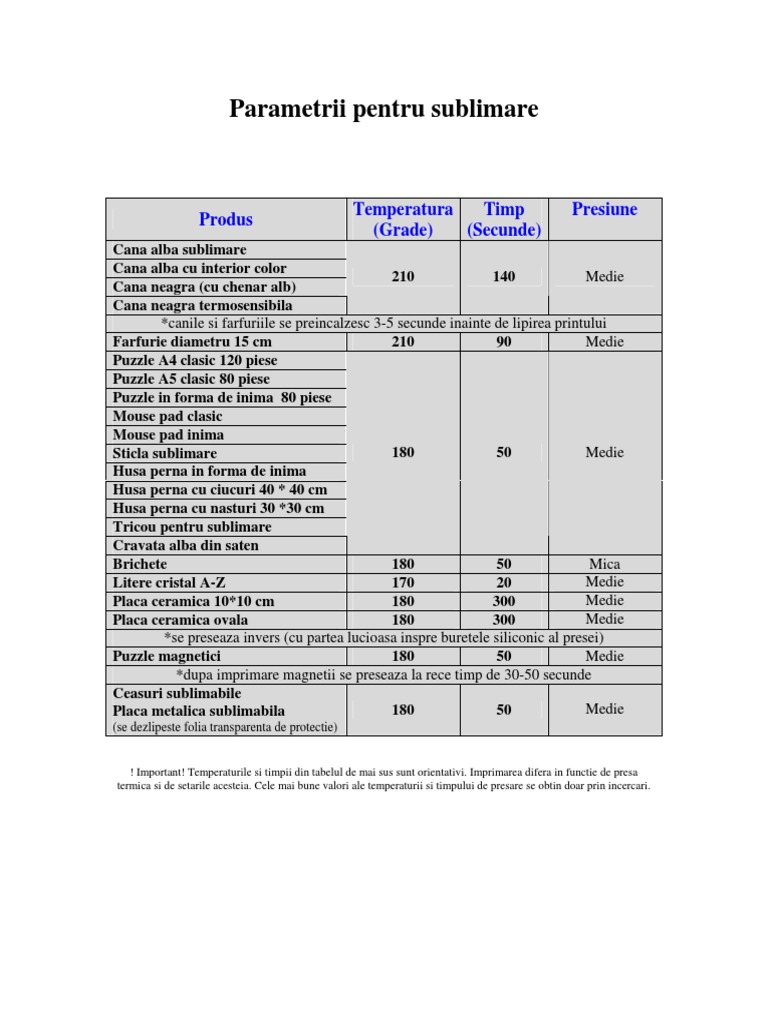! Important! Temperaturile si timpii din tabelul de mai sus sunt orientativi. Imprimarea difera in functie de presa