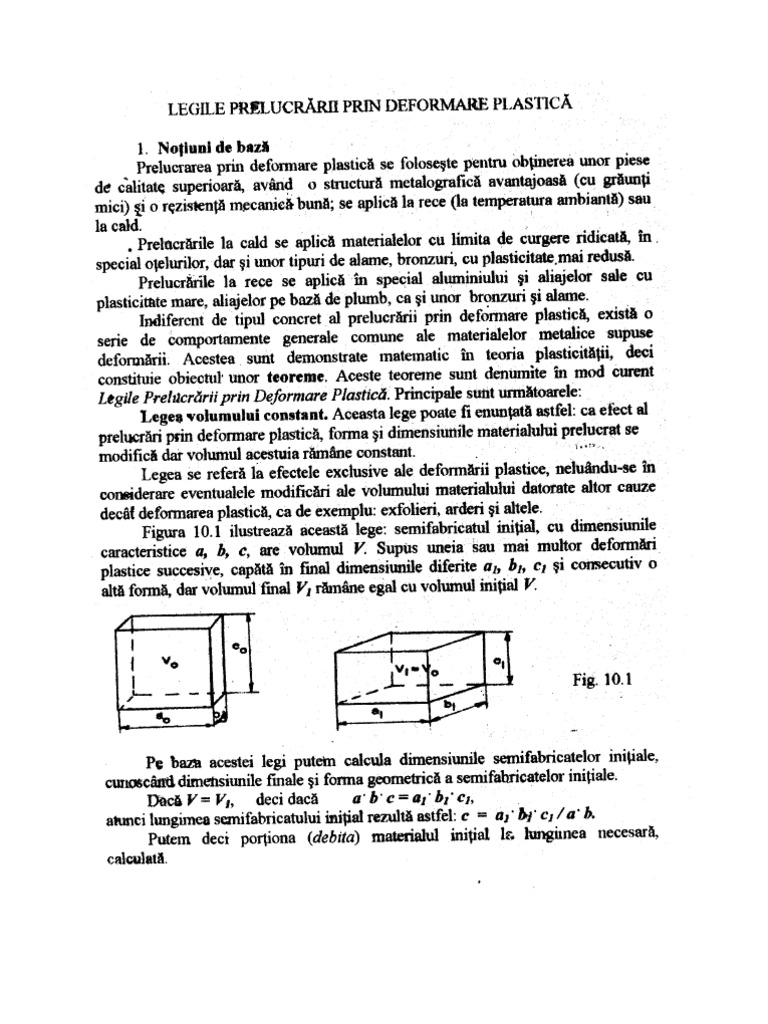 Figura 10.1 ilustreaza aceasta lege: semifabricstul initial,cu dimensiunile caracteristice a, b, c, are vo1umul V. Supus uneiasau: mai multor deformAri plastiee succesive, capAtl infmal dimensiunile diferite aI, b1, CI ~i consecutiv 0 altA fonna, dar volumulfinal VI rAmane egro co volumul initial V.