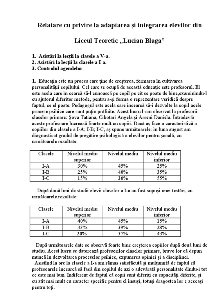 Relatare cu privire la adaptarea şi integrarea elevilor din