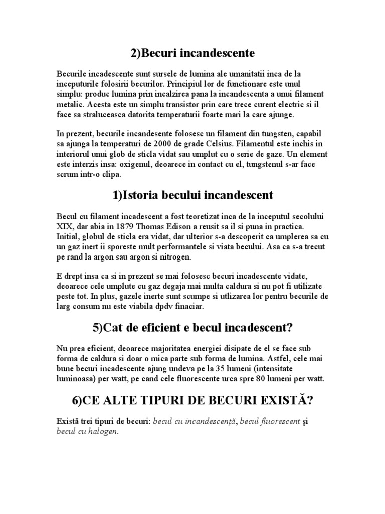 Există trei tipuri de becuri: becul cu incandescenţă, becul fluorescent şi