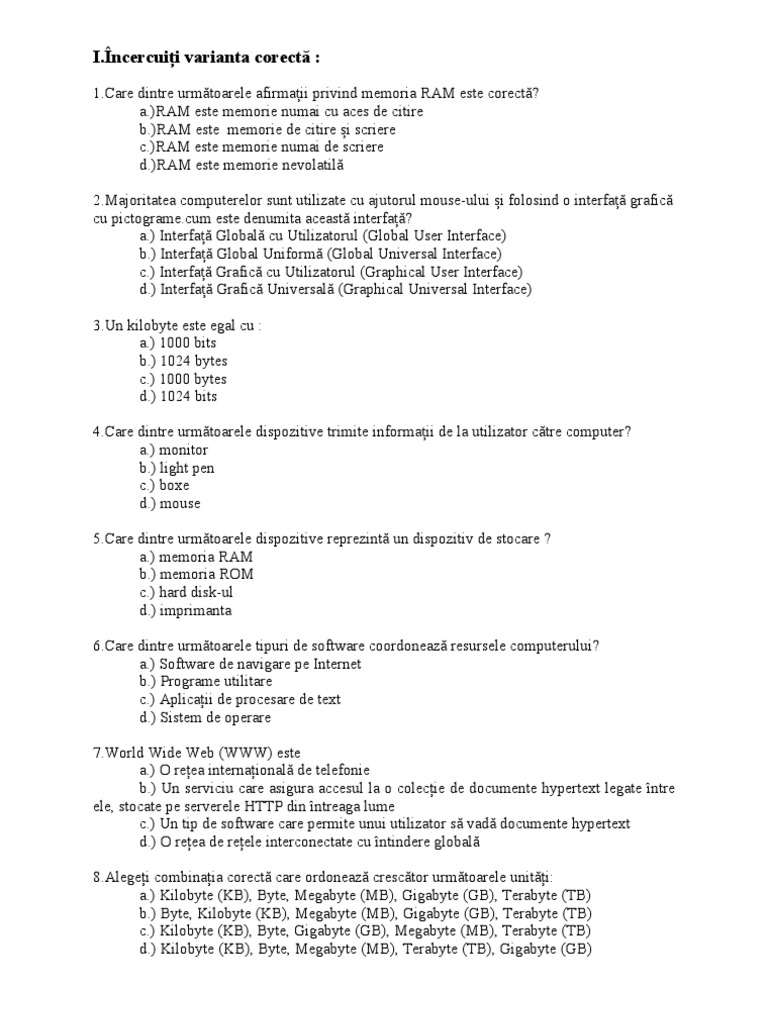 I. 1.b 2.c 3.b 4.b și d 5.c