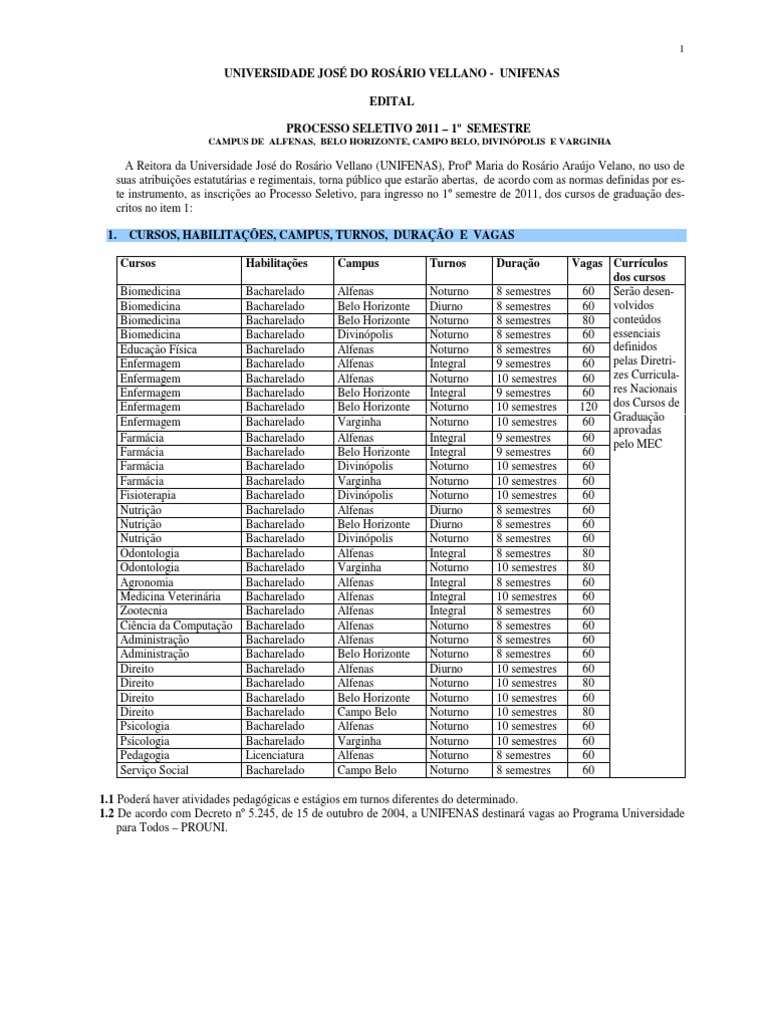 7.8 Respeitados os prazos e as condições para matrícula, o Processo Seletivo de 2011 (1º Semestre) da UNIFENAS terá