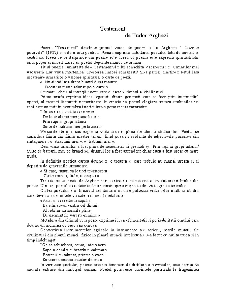 Poezia “Testament” deschide primul voum de poezii a lui Arghezii “ Cuvinte