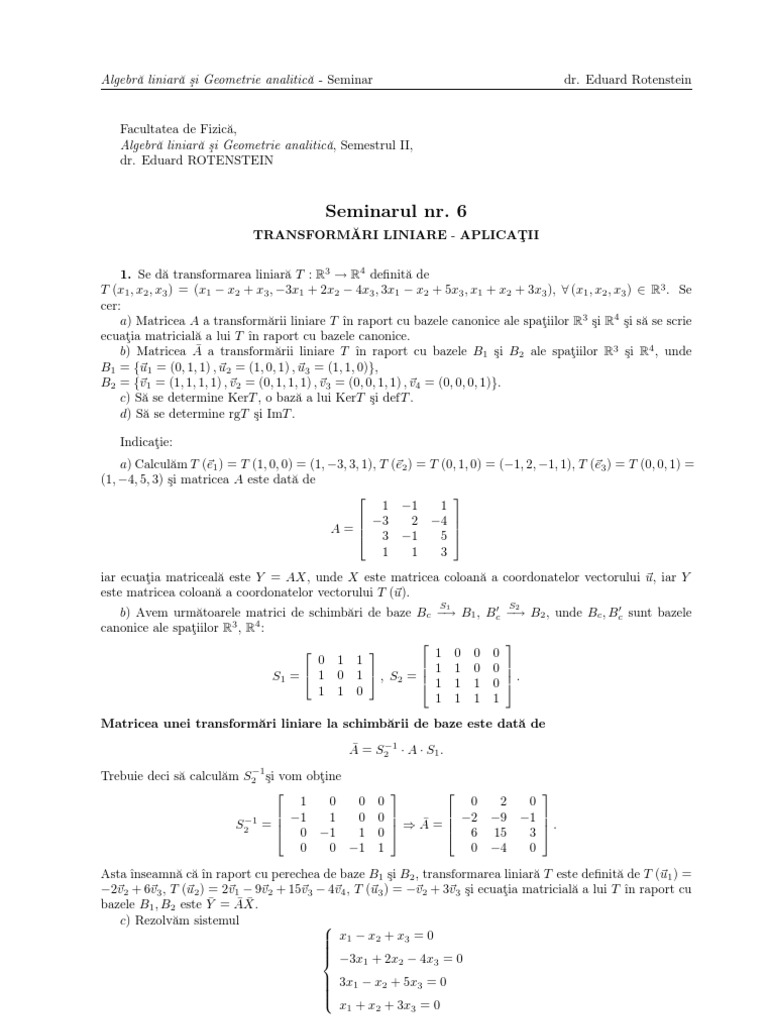 Algebră liniară şi Geometrie analitică - Seminar dr. Eduard Rotenstein