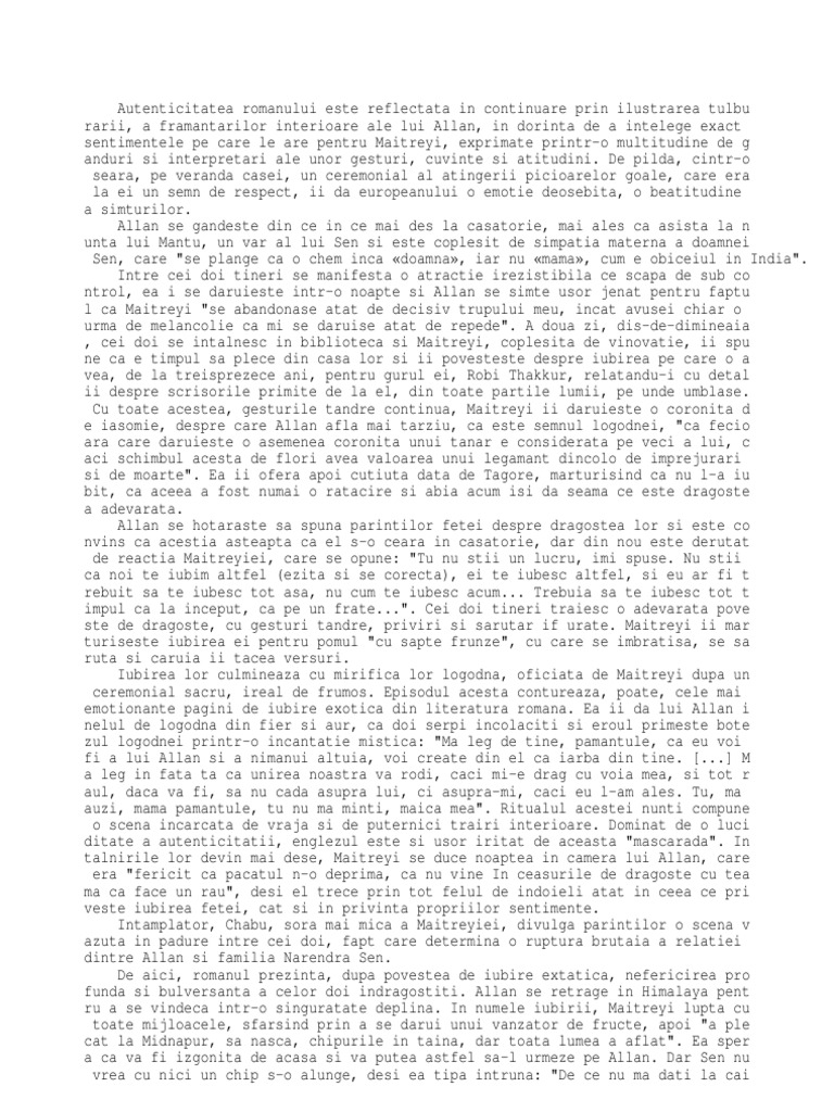 iner si Maitreyi, o bengaleza de saisprezece ani. Intamplarile sunt povestite pe