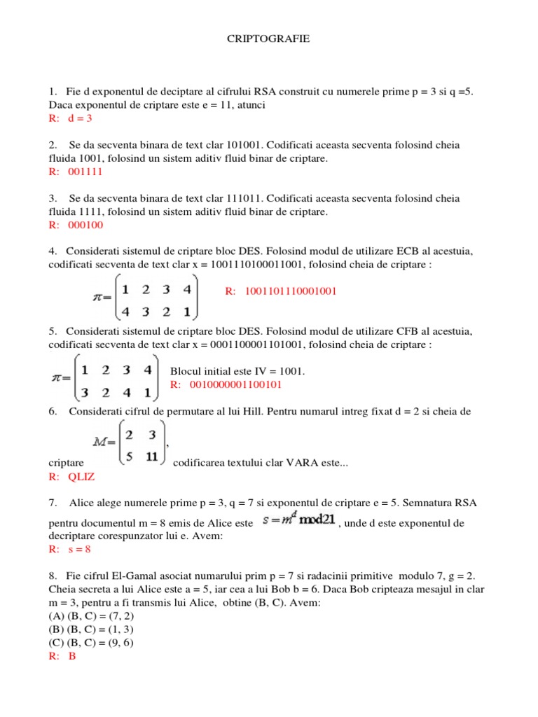 criptat (1, 3) al textului in clar. Decodificand, se obtine mesajul clar