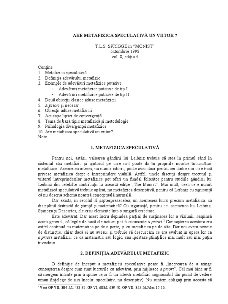 privesc metafizica drept o întreprindere viabilă. Astfel, unele discuţii despre trecutul şi