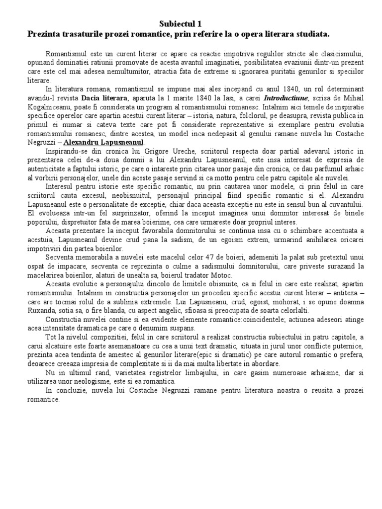 romantismului romanesc, dintre acestea, un model inca nedepasit al genului ramane nuvela lui Costache
