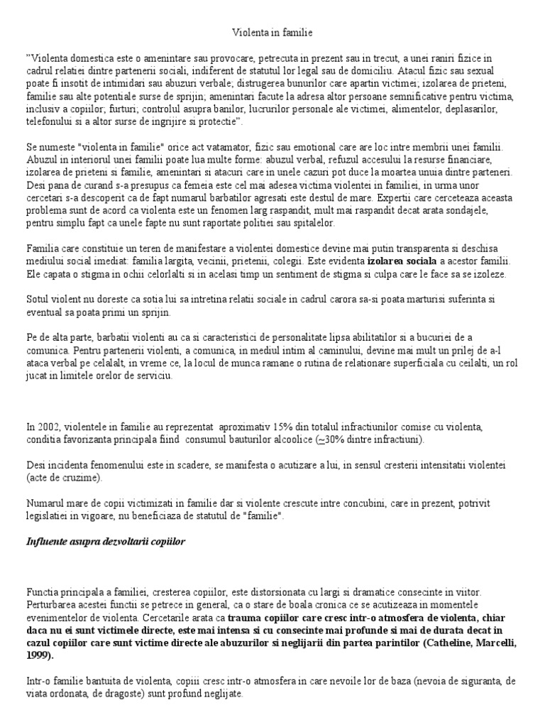 Se numeste "violenta in familie" orice act vatamator, fizic sau emotional care are loc intre membrii unei familii.