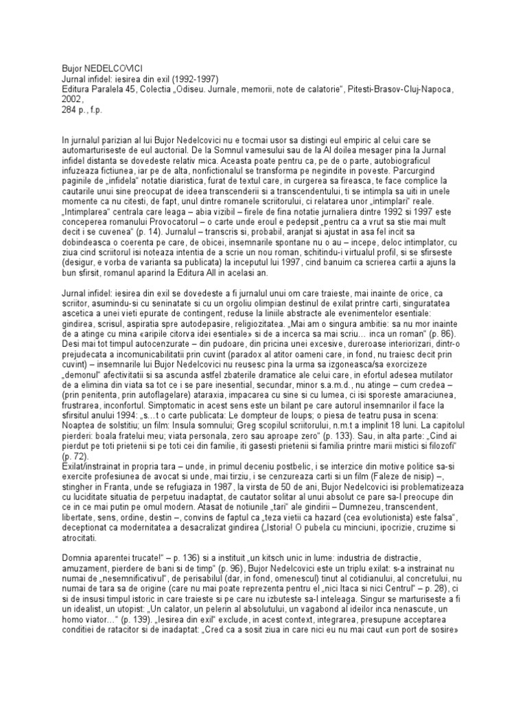 amuzament, pierdere de bani si de timp“ (p. 96), Bujor Nedelcovici este un triplu exilat: s-a instrainat nu