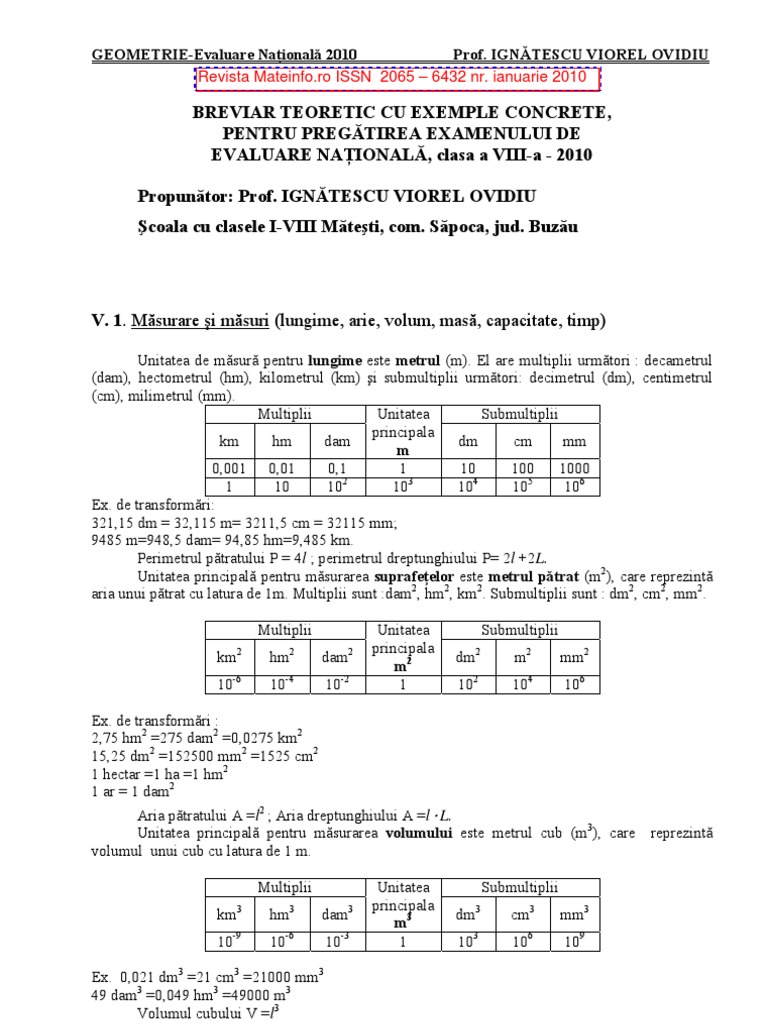 V. 1. Măsurare şi măsuri (lungime, arie, volum, masă, capacitate, timp)