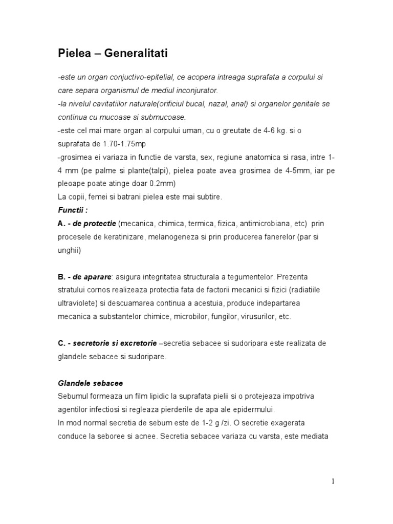 -este un organ conjuctivo-epitelial, ce acopera intreaga suprafata a corpului si care separa organismul de mediul inconjurator. -la nivelul cavitatiilor naturale(orificiul bucal, nazal, anal) si organelor genitale se continua cu mucoase si submucoase. -este cel mai mare organ al corpului uman, cu o greutate de 4-6 kg. si o suprafata de 1.70-1.75mp -grosimea ei variaza in functie de varsta, sex, regiune anatomica si rasa, intre 14 mm (pe palme si plante(talpi), pielea poate avea grosimea de 4-5mm, iar pe pleoape poate atinge doar 0.2mm) La copii, femei si batrani pielea este mai subtire. Functii : A. - de protectie (mecanica, chimica, termica, fizica, antimicrobiana, etc) prin procesele de keratinizare, melanogeneza si prin producerea fanerelor (par si unghii) B. - de aparare: asigura integritatea structurala a tegumentelor. Prezenta stratului cornos realizeaza protectia fata de factorii mecanici si fizici (radiatiile ultraviolete) si descuamarea continua a acestuia, produce indepartarea mecanica a substantelor chimice, microbilor, fungilor, virusurilor, etc. C. - secretorie si excretorie secretia sebacee si sudoripara este realizata de glandele sebacee si sudoripare. Glandele sebacee Sebumul formeaza un film lipidic la suprafata pielii si o protejeaza impotriva agentilor infectiosi si regleaza pierderile de apa ale epidermului. In mod normal secretia de sebum este de 1-2 g /zi. O secretie exagerata conduce la seboree si acnee. Secretia sebacee variaza cu varsta, este mediata
