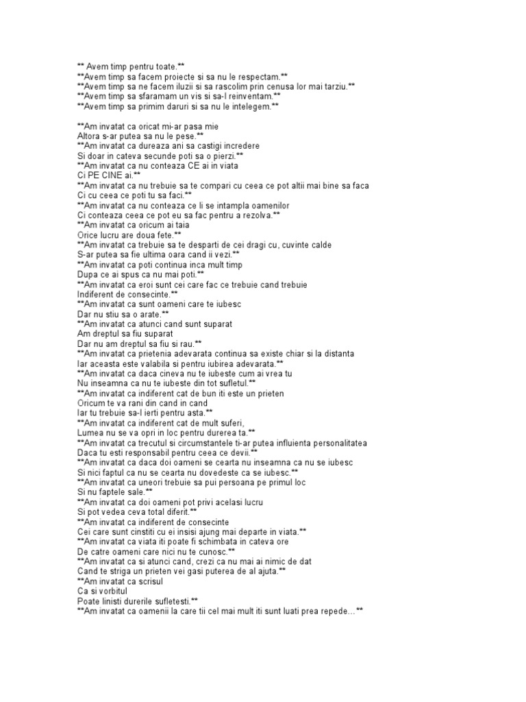 ** **Avem timp sa ne facem iluzii si sa rascolim prin cenusa lor mai tarziu.** **Avem timp sa sfaramam un vis si sa-l reinventam.** **Avem timp sa primim daruri si sa nu le intelegem.** **Am invatat ca oricat mi-ar pasa mie Altora s-ar putea sa nu le pese.** **Am invatat ca dureaza ani sa castigi incredere Si doar in cateva secunde poti sa o pierzi.** **Am invatat ca nu conteaza CE ai in viata Ci PE CINE ai.** **Am invatat ca nu trebuie sa te compari cu ceea ce pot altii mai bine sa faca Ci cu ceea ce poti tu sa faci.** **Am invatat ca nu conteaza ce li se intampla oamenilor Ci conteaza ceea ce pot eu sa fac pentru a rezolva.** **Am invatat ca oricum ai taia Orice lucru are doua fete.** **Am invatat ca trebuie sa te desparti de cei dragi cu, cuvinte calde S-ar putea sa fie ultima oara cand ii vezi.** **Am invatat ca poti continua inca mult timp Dupa ce ai spus ca nu mai poti.** **Am invatat ca eroi sunt cei care fac ce trebuie cand trebuie Indiferent de consecinte.** **Am invatat ca sunt oameni care te iubesc Dar nu stiu sa o arate.** **Am invatat ca atunci cand sunt suparat Am dreptul sa fiu suparat Dar nu am dreptul sa fiu si rau.** **Am invatat ca prietenia adevarata continua sa existe chiar si la distanta Iar aceasta este valabila si pentru iubirea adevarata.** **Am invatat ca daca cineva nu te iubeste cum ai vrea tu Nu inseamna ca nu te iubeste din tot sufletul.** **Am invatat ca indiferent cat de bun iti este un prieten Oricum te va rani din cand in cand Iar tu trebuie sa-l ierti pentru asta.** **Am invatat ca indiferent cat de mult suferi, Lumea nu se va opri in loc pentru durerea ta.** **Am invatat ca trecutul si circumstantele ti-ar putea influienta personalitatea Daca tu esti responsabil pentru ceea ce devii.** **Am invatat ca daca doi oameni se cearta nu inseamna ca nu se iubesc Si nici faptul ca nu se cearta nu dovedeste ca se iubesc.** **Am invatat ca uneori trebuie sa pui persoana pe primul loc Si nu faptele sale.** **Am invatat ca doi oameni pot privi acelasi lucru Si pot vedea ceva total diferit.** **Am invatat ca indiferent de consecinte Cei care sunt cinstiti cu ei insisi ajung mai departe in viata.** **Am invatat ca viata iti poate fi schimbata in cateva ore De catre oameni care nici nu te cunosc.** **Am invatat ca si atunci cand, crezi ca nu mai ai nimic de dat Cand te striga un prieten vei gasi puterea de al ajuta.** **Am invatat ca scrisul Ca si vorbitul Poate linisti durerile sufletesti.** **Am invatat ca oamenii la care tii cel mai mult iti sunt luati prea repede**