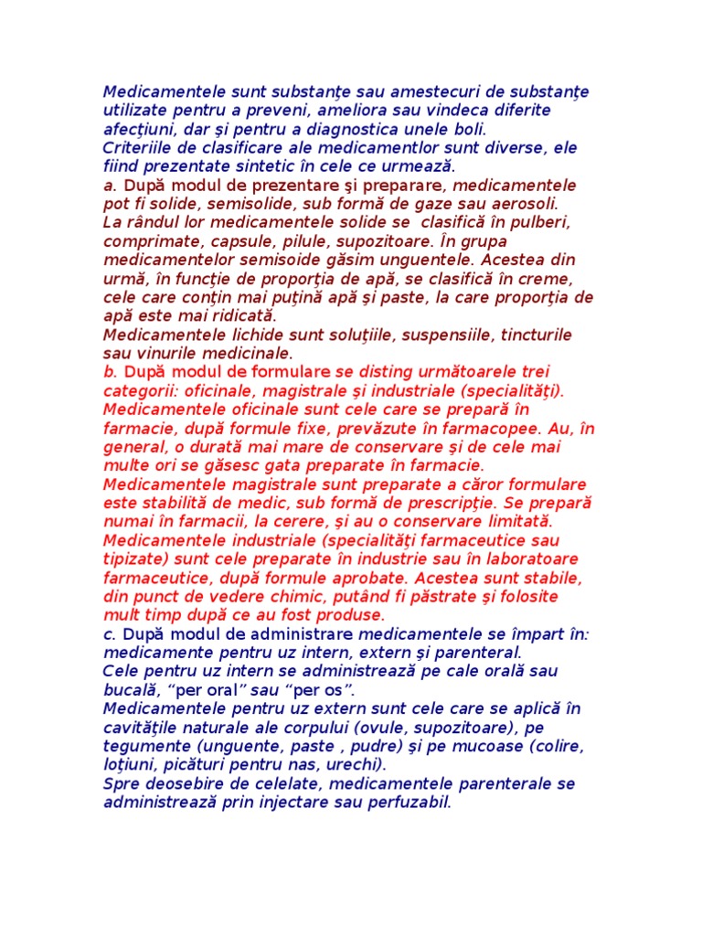 i pentru a diagnostica unele boli. Criteriile de clasificare ale medicamentlor sunt diverse, ele fiind prezentate sintetic n cele ce urmeaz. a. Dup modul de prezentare i preparare, medicamentele pot fi solide, semisolide, sub form de gaze sau aerosoli. La rndul lor medicamentele solide se clasific n pulberi, comprimate, capsule, pilule, supozitoare. n grupa medicamentelor semisoide gsim unguentele. Acestea din urm, n funcie de proporia de ap, se clasific n creme, cele care conin mai puin ap i paste, la care proporia de ap este mai ridicat. Medicamentele lichide sunt soluiile, suspensiile, tincturile sau vinurile medicinale. b. Dup modul de formulare se disting urmtoarele trei categorii: oficinale, magistrale i industriale (specialiti). Medicamentele oficinale sunt cele care se prepar n farmacie, dup formule fixe, prevzute n farmacopee. Au, n general, o durat mai mare de conservare i de cele mai multe ori se gsesc gata preparate n farmacie. Medicamentele magistrale sunt preparate a cror formulare este stabilit de medic, sub form de prescripie. Se prepar numai n farmacii, la cerere, i au o conservare limitat. Medicamentele industriale (specialiti farmaceutice sau tipizate) sunt cele preparate n industrie sau n laboratoare farmaceutice, dup formule aprobate. Acestea sunt stabile, din punct de vedere chimic, putnd fi pstrate i folosite mult timp dup ce au fost produse. c. Dup modul de administrare medicamentele se mpart n: medicamente pentru uz intern, extern i parenteral. Cele pentru uz intern se administreaz pe cale oral sau bucal, per oral sau per os. Medicamentele pentru uz extern sunt cele care se aplic n cavitile naturale ale corpului (ovule, supozitoare), pe tegumente (unguente, paste , pudre) i pe mucoase (colire, loiuni, picturi pentru nas, urechi). Spre deosebire de celelate, medicamentele parenterale se administreaz prin injectare sau perfuzabil.
