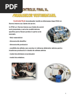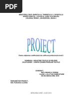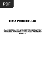 innd cont c n ultimii ani s-a obinuit s se poarte mereu pantalonul , am decis s aleg pantalonul deoarece asigura un anumit confort i o anumita lejeritate n timpul purtrii. La aceasta perioad a vieii, adolescenii au posibilitatea sa-si pun n valoare corpul fr eforturi prea mari. Pentru proiectarea pantalonului se folosesc materiale textile moi i cu posibilitate de ntreinere uoar deoarece pantalonul este produsul de mbrcminte cel mai frecvent utilizat n rndul tinerilor. Pantalonul este un produs textil (finit) care mbrac corpul n partea inferioar a lui, fiind un produs de mbrcminte cu sprijin pe talie. Pantalonul pentru barbati se utilizeaza in toate anotimpurile anului si se confectioneaza din materiale diferite ( ex. Stofa, blug, etc ). Desi este un vestiment caracteristic barbatesc, acest produs, este utilizat de catre toate categoriile de purtatori indiferent de varsta sau de sex. In functie de acest criteriu, pantalonii sunt destinati pentru barbati, femei si copii. Pantalonii se confectioneaza in diferite variante, cele mai importante sunt: pantalonii clasici ( drept ) pantalonul bufant pentru cizma pantalonul sport pantalonul clasic pentru femei Fiecare produs vestimentar este alctuit din detalii componente numite detalii principale i detalii secundare. Detaliile principale sunt parti componente ale imbracamintei care nu pot lipsii din structura fizica a unui produs. La imbracamintea fixata pe umeri, detaliile principale sunt reprezentate prin spate, piepti, guler si maneci, iar la imbracamintea fixata pe talie prin fete, spate si betelii sau cordoane. Exceptie de la aceasta regula fac unele produse ca: rochii, bluzee, veste, pulovere, care in functie de moda pot fi prevazute fara guler si fara maneci . Detaliile secundare. Sunt acele componente ale imbracamintei care pot lipsi din structura fizica a produsului. Astfel, de exemplu, pot fi: buzunare, gaici, epoleti si alte detalii de acest gen, care in functie de model nu sunt prevazute la modelul confectionat. Acest produs de mbrcminte este alctuit din detalii principale (faa pantalonului, spatele pantalonului, betelie) i detalii secundare (buzunare). Cele doua parti principale fata si spatele sunt asemanatoare ca forma dar difera ca marime si detalii anexate. Materialul textil a fost ales n funcie de destinaia produsului. Am inut cont de proprietile igienico-funcionale pe care trebuie s le ndeplineasc un produs de mbrcminte i am ales un material tip bumbac care ndeplinete aceleai proprieti ca ale bumbacului. Pentru ncheierea produsului de mbrcminte am folosit fermoar i nasture care este mai mult sau mai puin practic sau n linia modei. Nasturii i accesoriile de ncheiat se pot monta pe produs manual sau cu ajutorul mainilor. Custura de montare a nasturilor trebuie s fie rezistent n timpul purtrii i s permit ncheierea uoar a produsului. Betelia pantalonului va fi realizat mpreun cu canafasul, o ntritur obinut din [Link] terminaia produsului pantalonul prezint un tiv de 0,5 cm.