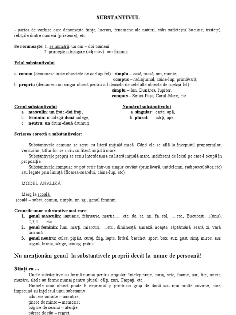 - partea de vorbire care denumete fiine, lucruri, fenomene ale naturii, stri sufleteti( bucurie, tristee), relaiile dintre oameni (prietenie), etc. Se recunoate: 1. se numr: un om doi oameni 2. primete o nsuire (adjectiv): om frumos Felul substantivului: a. comun (denumesc toate obiectele de acelai fel) : simplu cas, mas, om, munte; compus radiojurnal, cine-lup, primvar; b. propriu (denumesc un singur obiect pentru a-l deosebi de celelalte obiecte de acelai fel) : simplu Ion, Dunrea, Jupiter; compus Sinan-Paa, Carul-Mare, etc Genul substantivului: a. masculin: un frate-doi frai; b. feminin: o coleg-dou colege; c. neutru: un drum-dou drumuri. Scrierea corect a substantivelor: Substantivele comune se scriu cu liter iniial mic. Cnd ele se afl la nceputul propoziiilor, versurilor, titlurilor se scriu cu liter iniial mare. Substantivele proprii se scriu ntotdeauna cu liter iniial mare, indiferent de locul pe care-l ocup n propoziie. Substantivele compuse se pot scrie ntr-un singur cuvnt (primvar, untdelemn, radioasculttor,etc) sau legate prin liniu (floarea-soarelui, cine-lup, etc). MODEL ANALIZ: Merg la coal. coal subst. comun, simplu, nr. sg., genul feminin. Genurile unor substantive mai rare: 1. genul masculin: ianuarie, februarie, martie,......etc, do, re, mi, fa, sol, .....etc., Bucureti, 1(unu), 2,3,4.......etc 2. genul feminin: luni, mari, miercuri, ....etc., diminea, amiaz, noapte, sptmn, sear, zi, var, toamn. 3. genul neutru: cules, pipit, curaj, frig, lapte, fotbal, baschet, sport, box, auz, gust, sim, miros, aur, argint, bronz, snge, amurg, prnz. Numrul substantivului: a. singular: carte, ap; b. plural: cri, ape;